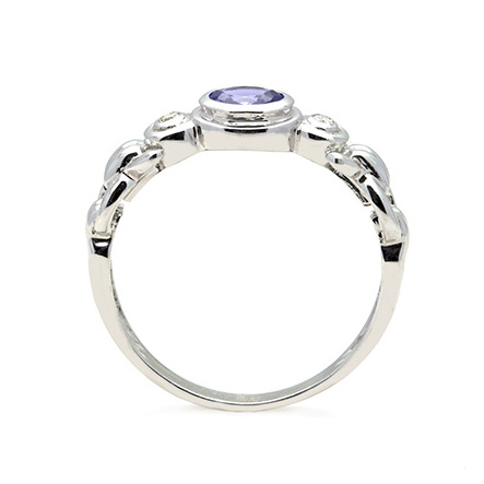 The bezel setting for the duo diamonds and oval-cut Tanzanite gemstone is perfect paired with the band’s unique shoulder design. Crafted from 14 Carat white gold, this sensational engagement ring is sure to steal many glances.