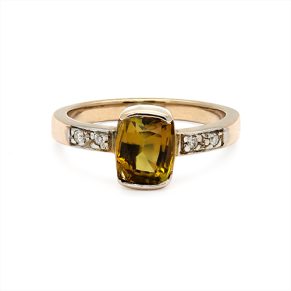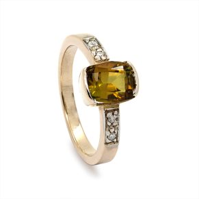 An emerald green Tsavorite stone flashes seductively at the center of this exceptional engagement ring. Cushion-cut and held in four prongs, the gem is captivating on this 18 Carat white gold band, and the channel diamonds that decorate the ring?s shoulders are a perfect touch of shimmering beauty.