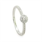 Delicately crafted in 18 carat white gold, this engagement ring features a brilliant round diamond secured in a foursix-prong setting, evoking a graceful floral silhouette. The slim band is adorned with sparkling pavé-set diamonds, adding extra shimmer while drawing the eye to the radiant centre stone. A timeless choice for those seeking refined elegance.