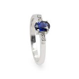 The bezel setting brings out the magnificence of the round-cut Tanzanite gemstone, the radiance of the six diamond side stones not escaping the eye. Put together on this reverse tapered 18 Carat white gold band, the ring’s grandeur is befitting.