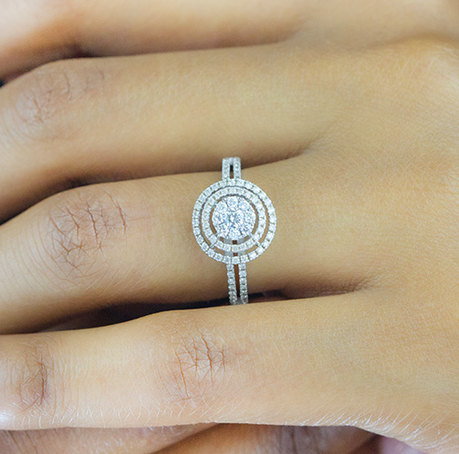 Celebrate your forever with this stunning 18-carat white gold diamond engagement ring—a true symbol of elegance and commitment. Crafted to perfection, the ring features a striking round cluster of brilliant-cut diamonds at its centre, beautifully framed by two concentric halos of diamonds. The split shank, adorned with pavé-set diamonds, enhances its sparkle from every angle.