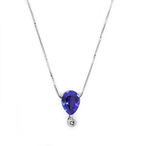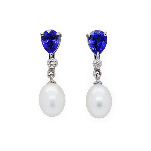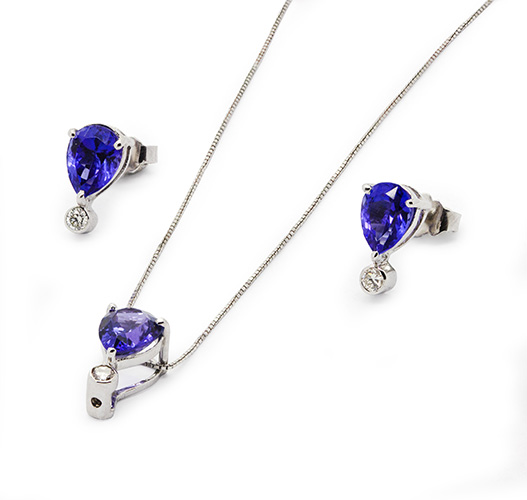 Elevate your elegance with this stunning 18-carat white gold set, featuring striking pear-cut tanzanite gemstones and radiant white pearls. This versatile set includes a matching pendant and earrings, each showcasing a rich blue tanzanite centrepiece, brilliantly accented by sparkling diamonds.