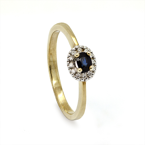 A cute oval-cut blue Sapphire sits amidst an equally cute halo of diamonds fashioning the dazzling apex of this knife-edge designed shank of the 9 Carat solid yellow gold engagement ring.