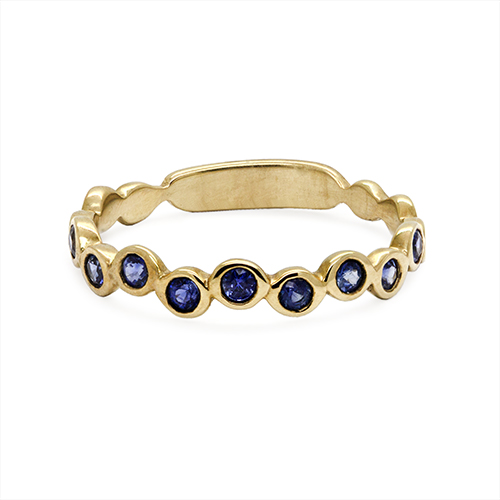 Round blue Sapphire gemstones gloriously poke out of this 9 Carat solid yellow gold band, held securely in a bezel setting that wiggles ever-so-moderately, to form the design on this impressive engagement ring.