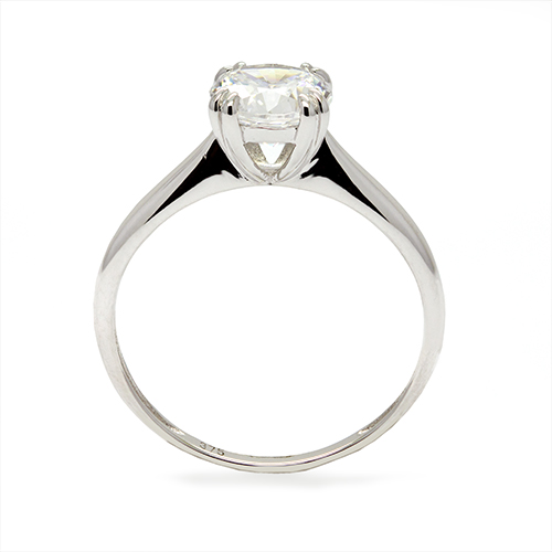 This ring features a stunning round-cut cubic zirconia stone held securely in a four-claw setting, allowing maximum light to pass through for brilliant sparkle.