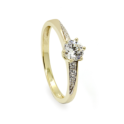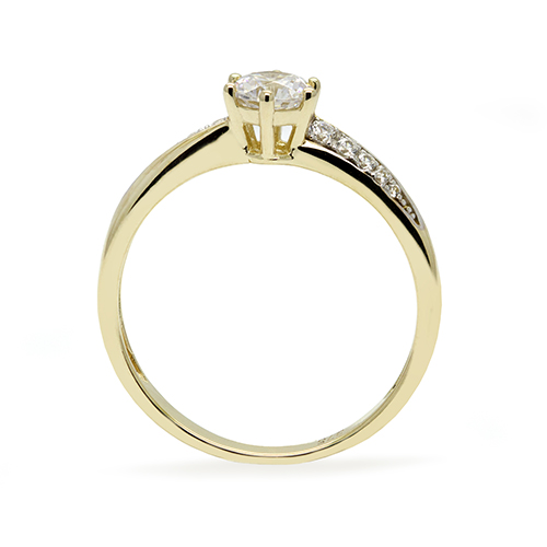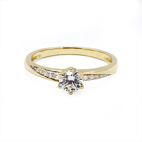 This 9-carat yellow gold engagement ring features a stunning round-cut cubic zirconia center stone that captures light beautifully, creating a captivating sparkle.
