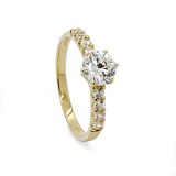 The ridged pattern on this 9 Carat solid yellow gold shank appears as waves moving to a shore of white diamonds and a compelling, oval-cut Garnet gemstone. An attractive piece of engagement jewellery.