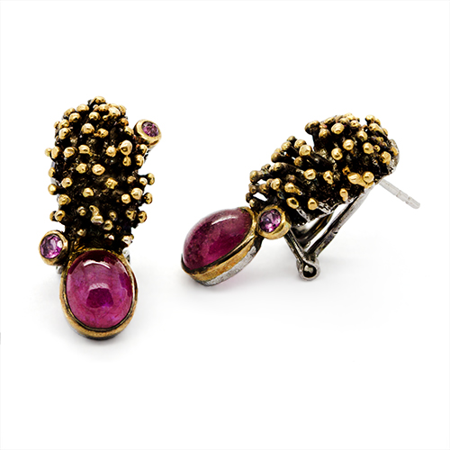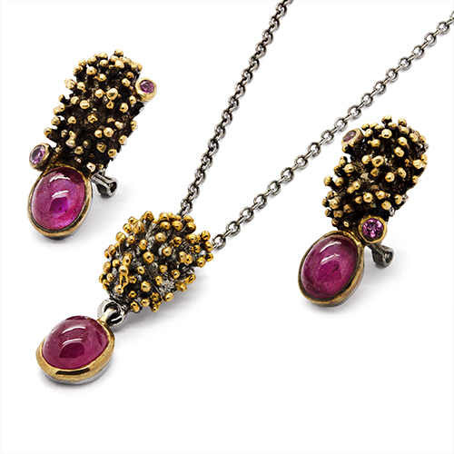 The bezel set Ruby stone extended from a mod reef style presents an outstanding pendant set on Sterling Silver. Polished with gold and black Rhodium elements, the bubble-gum pink of the gem coupled with the plating effect makes a superbly subtle earring and necklace pair.