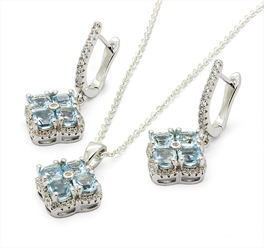 Each stone is surrounded by sparkling cubic zirconia accents, enhancing the brilliance of the stones and adding a refined shimmer from every angle. The set includes a matching pendant, elegant earrings, and a ring, creating a perfect blend of color, sparkle, and timeless style.