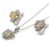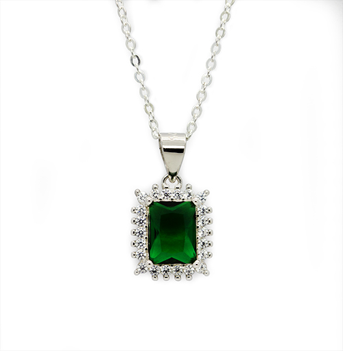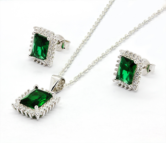 The rich green rectangular stones create a luxurious focal point, while the surrounding pav? accents add dazzling brilliance from every angle. The set includes a matching pendant and elegant stud earrings, perfectly coordinated to deliver a refined and sophisticated look.