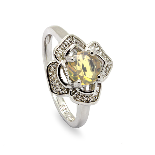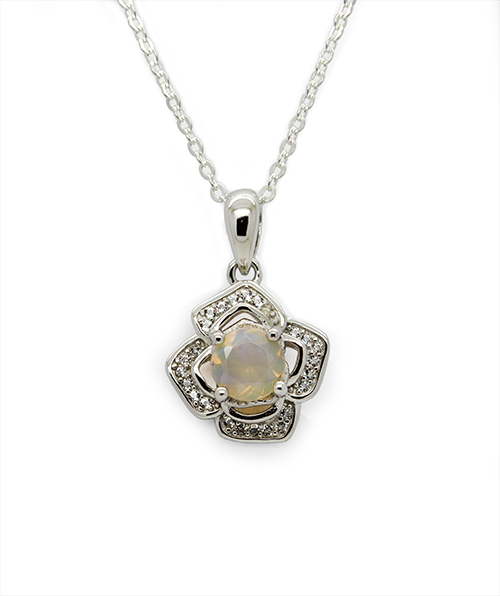 The opal is beautifully framed by sparkling cubic zirconia accents, arranged in a graceful, petal-inspired setting that enhances the stone’s natural glow.