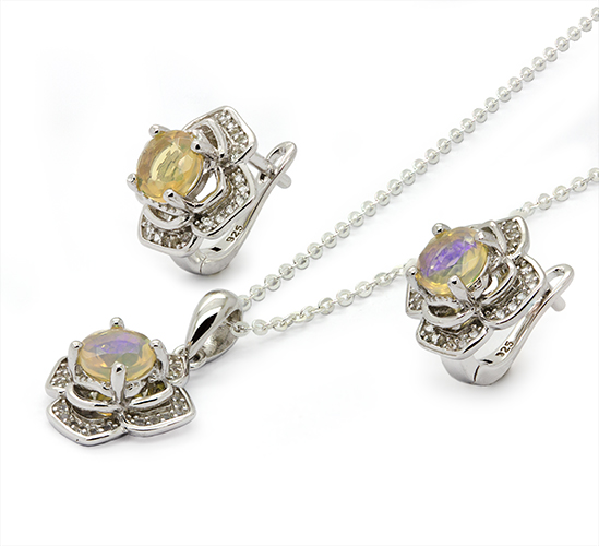 Radiating soft, iridescent colors and refined brilliance, the Opal necklace set is designed to capture attention with effortless elegance. Crafted in sterling silver, this sophisticated set features a mesmerizing oval opal center stone that reflects delicate flashes of gold, lavender, and soft rainbow hues as it catches the light.