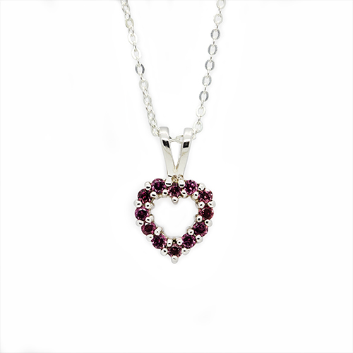 Each meticulously set rhodolite stone forms a shimmering heart, a timeless symbol of affection and devotion. Suspended from a sleek sterling silver chain, this pendant sits gracefully on the neckline, perfect for infusing everyday moments with beauty or celebrating special occasions.